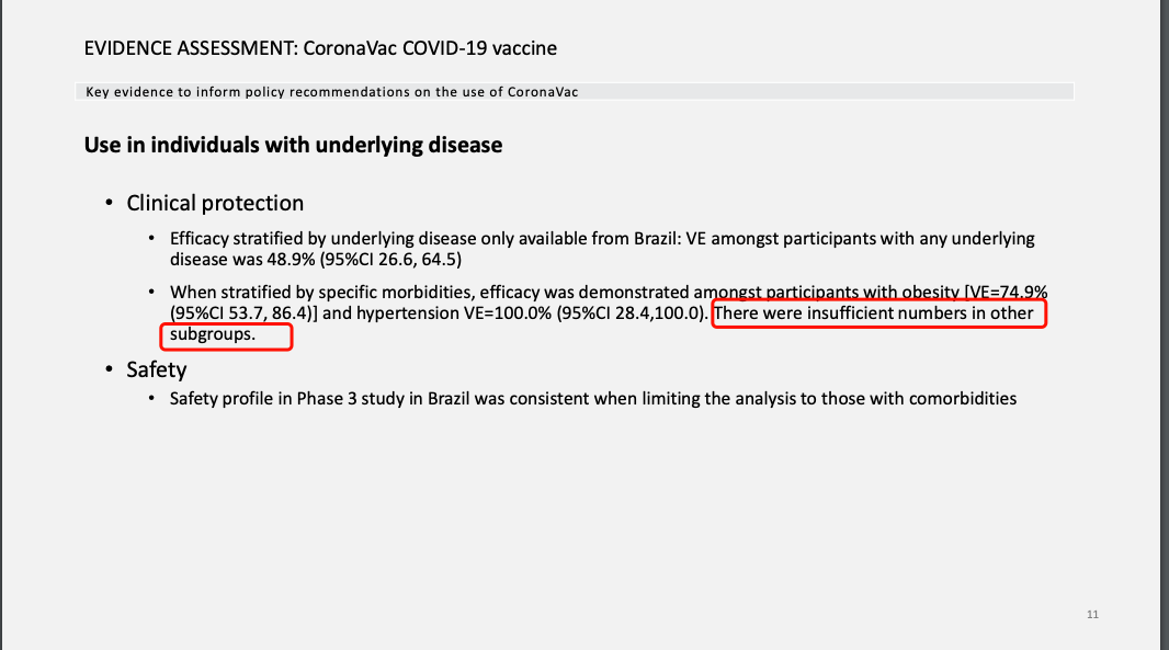 巴西:随机试验,预防有症状的新冠肺炎效力51%,预防住院效力100%。看新闻:目前考虑数值较低的原因是间隔时间短(14天)、接种的是医务人员。(这一句不是who报告原内容)
