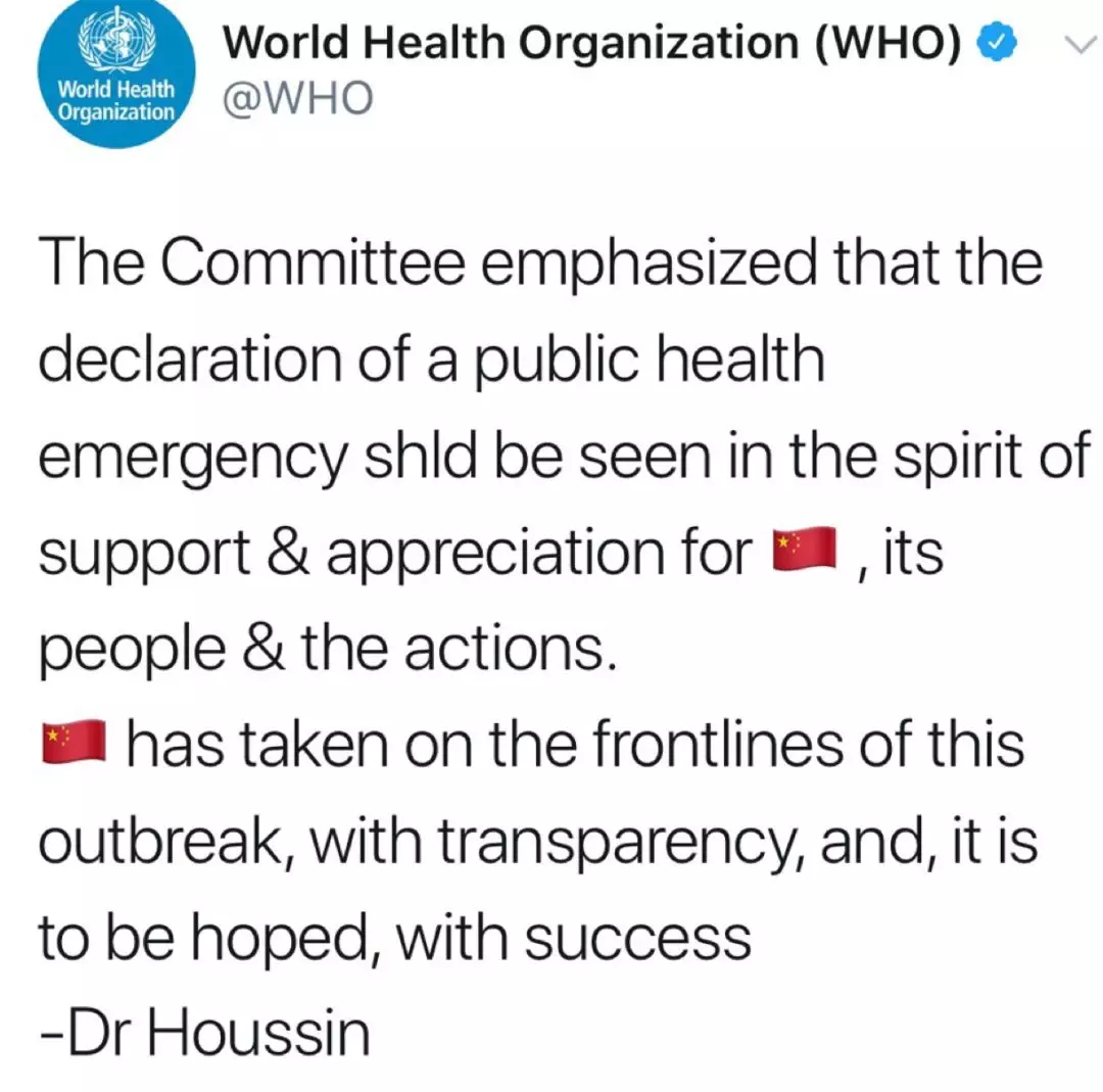 WHO总干事谭德塞表示,自疫情爆发以来,中国政府采取了十分有效的管控措施,不只对有效地控制了病毒在国内的传播,也有效地防止了病毒在全球范围内的传播。但由于病毒可能会传播至医疗设施较弱的国家,为了更好地支持这些国家,我们宣布,新型冠状病毒疫情已经构成“国际关注的突发公共卫生事件”。