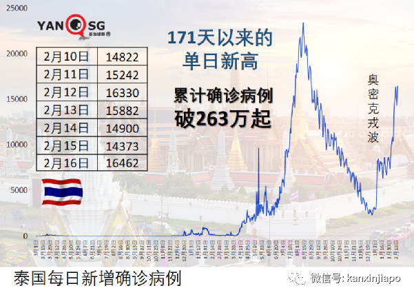 2月16日,泰国通报,过去24小时新增1万6462起确诊病例,累计263万9062起,破263万起。
